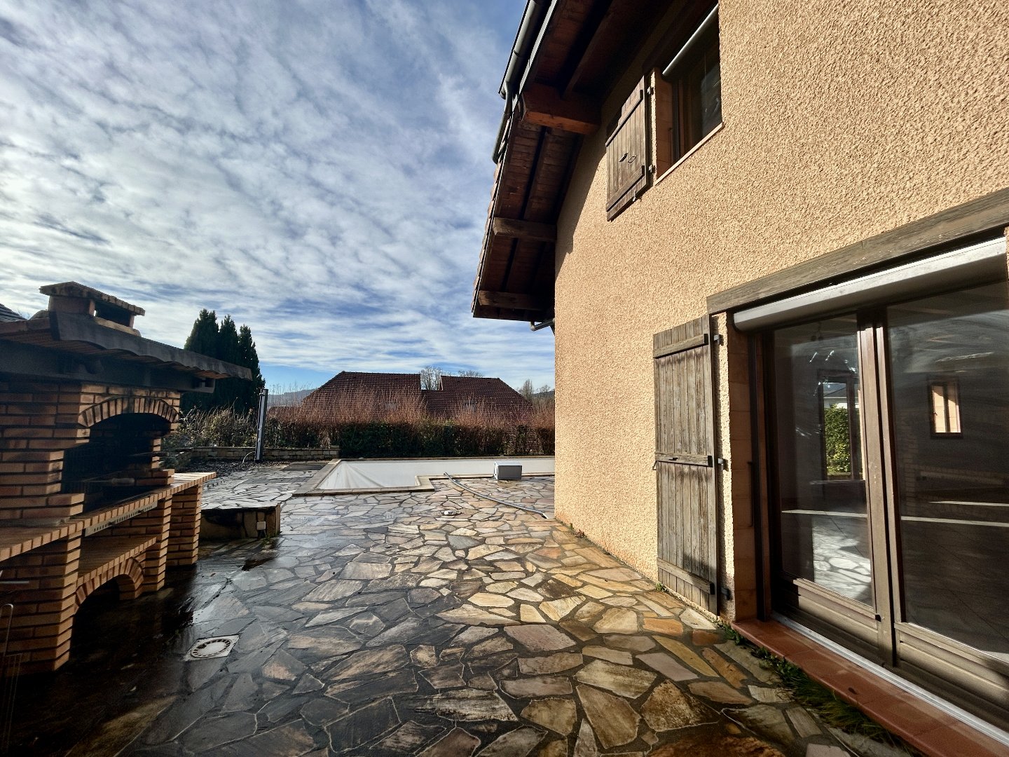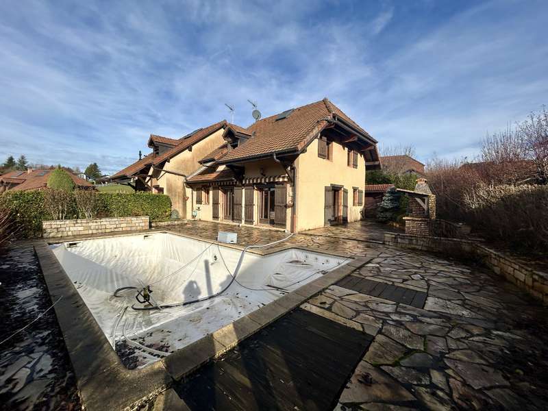 Sur les hauteurs de LA BALME DE SILLINGY à 2 minutes du centre, maison mitoyenne par le garage de type 5 pièces de 108, 65 m² LOI CARREZ et 140, 20 m² au sol. Au calme et lumineuse, vaste pièce de vie avec cuisine équipée, le tout s'ouvrant sur une terrasse de 367 m² avec pisicne, 4 chambres, 1 salle d'eau équipée, 2 wc. Sous-sol total. Petit garage, Mazot, stationnements extérieurs (3-4 voitures). Chauffage individuel gaz à condensation. Au sol pour le rez et radiateurs pour les étages. Travaux à prévoir, vous pourrez ainsi remettre à votre goût votre futur chez vous.
