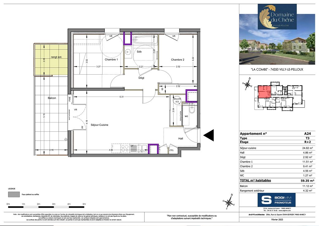 Situé entre Annecy et Genève, à Villy-le-Pelloux, le Domaine du Chêne est une résidence composée de 25 appartements neufs du 2 au 5 pièces et 11 Maisons de 3 à 5 chambres (mitoyenne et individuelle). Niché dans un cadre verdoyant, ce programme immobilier neuf offre un équilibre parfait entre nature et proximité des bassins d'emploi de la Haute-Savoie et du Léman.